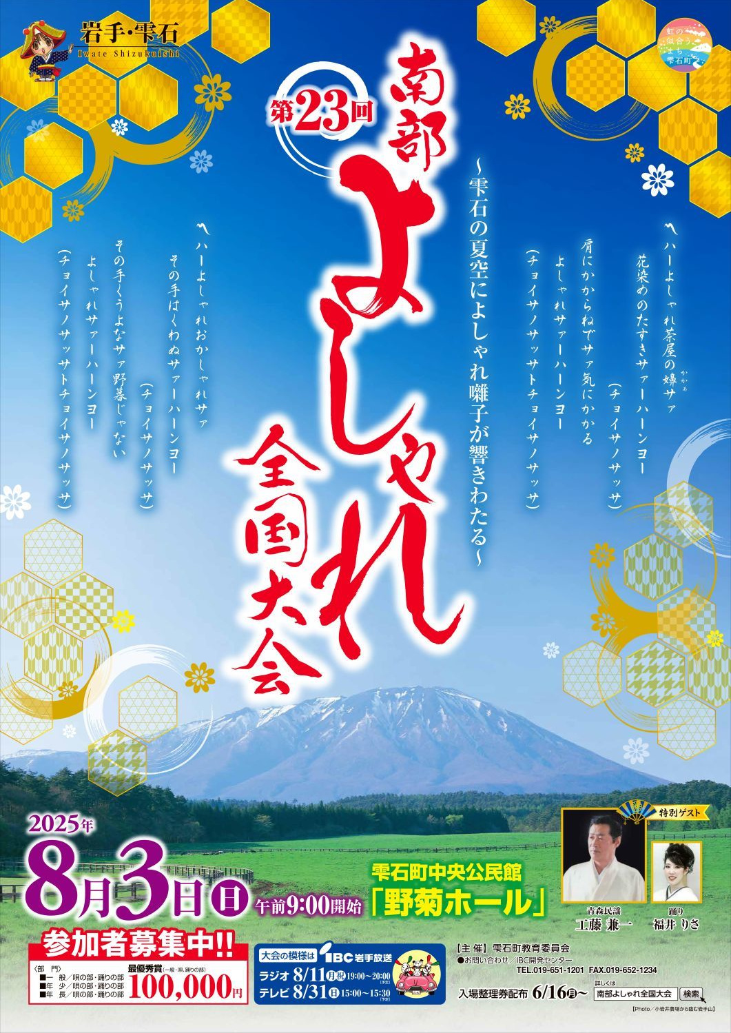 雫石の夏空によしゃれ囃子が響き渡る南部よしゃれ全国大会公式ホームページ 岩手県の民謡「南部よしゃれ」発祥の地は雫石町とされ 460年の歴史があると言われています 東北地方の代表的民謡のひとつとして、広く唄い、踊られてきました この伝統ある民俗芸能が、永く唄い、踊り継がれることを願い 南部よしゃれ全国大会を開催しています 第23回南部よしゃれ全国大会 終了しました! ご参加・ご来場ありがとうございました 大会の結果は歴代入賞者から お電話でのお問い合わせ019-651-1201受付時間平日午前9時30分~午後5時30分 トップぺージ 南部よしゃれの起源 開催要項 唄の部 歌詞 申込書 歴代入賞者 整理券配布 テレビ・ラジオ お問い合わせ